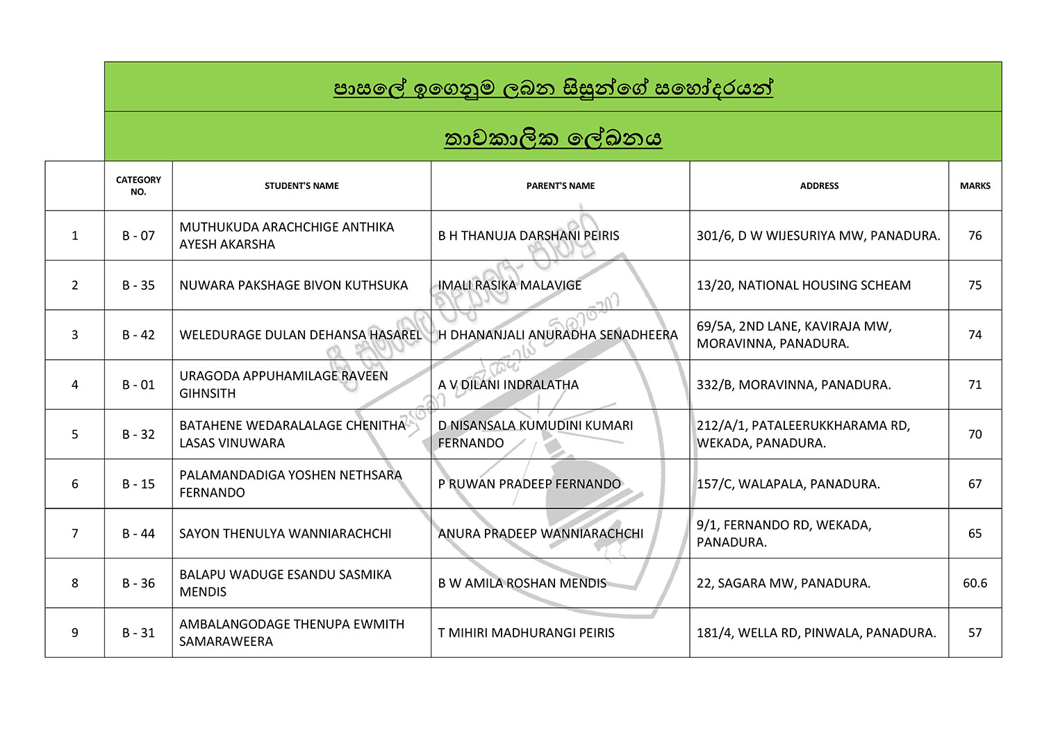 පාසලේ ඉගෙනුම ලබන සිසුන්ගේ සහෝදරයන් - තාවකාලික ලේඛනය